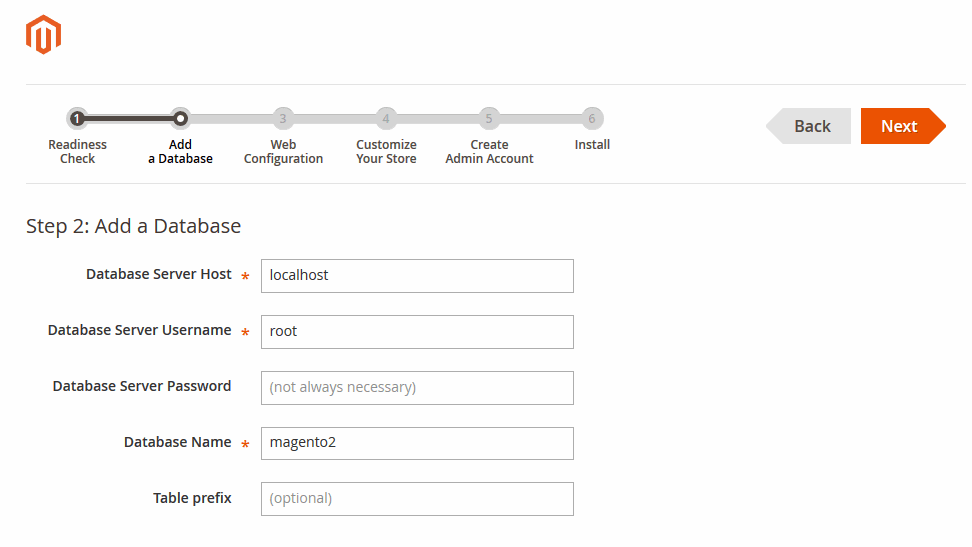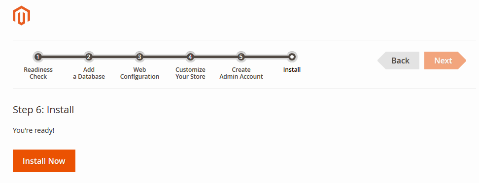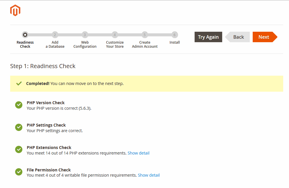 - Magento needs Php version 5.5 or above and MySql 5.6.0 or above. It will check for PHP settings, PHP Extensions and PHP Permissions Check. If it shows any issue, click on show detail and follow the on screen instructions.