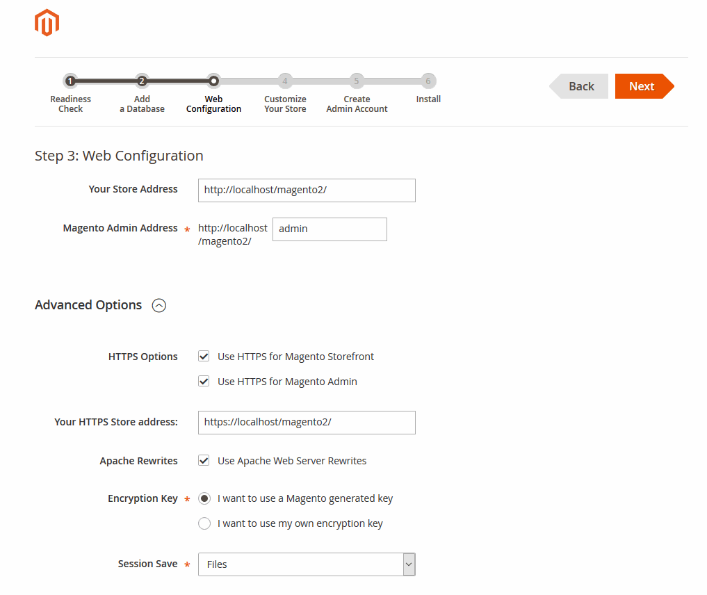 - Screen 3 will ask for the web configuration. It will automatically take your store address and generate random admin url. You can edit to keep it whatever you want. There are few advanced options like HTTPS option, If you want your store with https url. You must need to set up SSL for your website. Apache Rewrite, Encryption key, and session save are additional options.