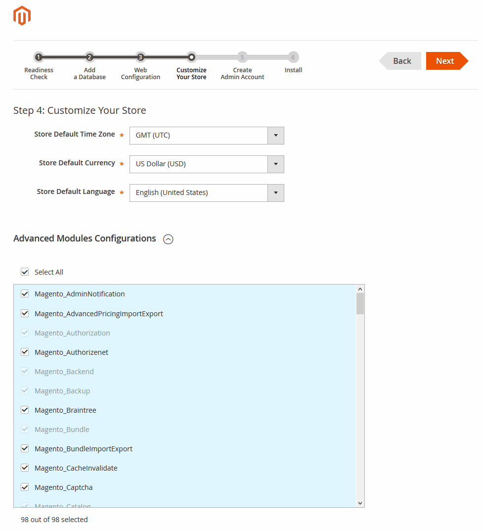 - Screen 4 will be Customize your store option. Select Time Zone, country and Language for your store. You can also look for Advanced Module Configurations. Actually Magento 2 comes with the default extensions and allows you to choose the default extensions whichever you want to install.