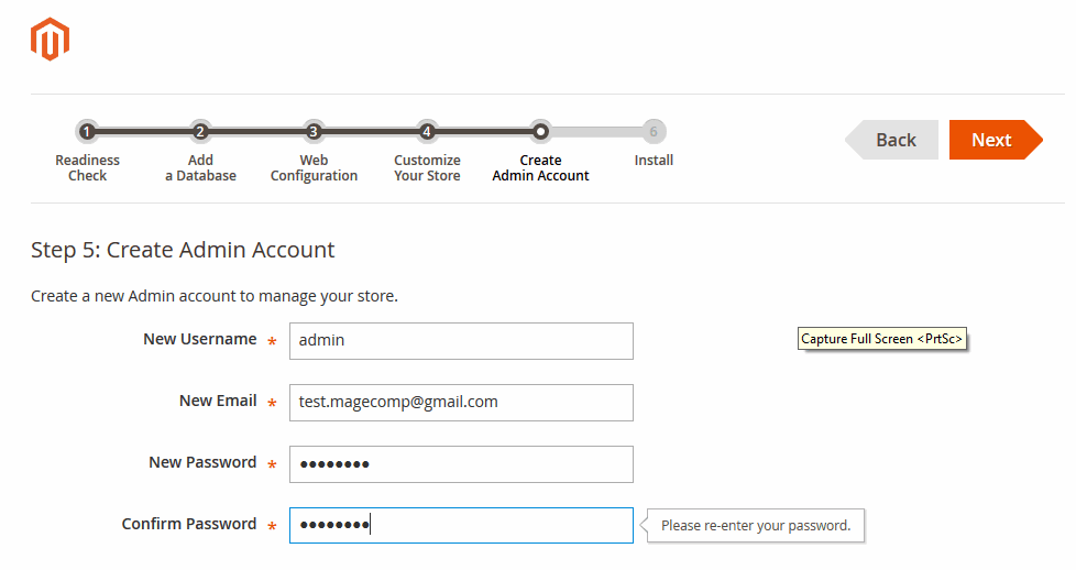 - Screen 5 is for creating admin account. Enter username, email and password and click on Next.