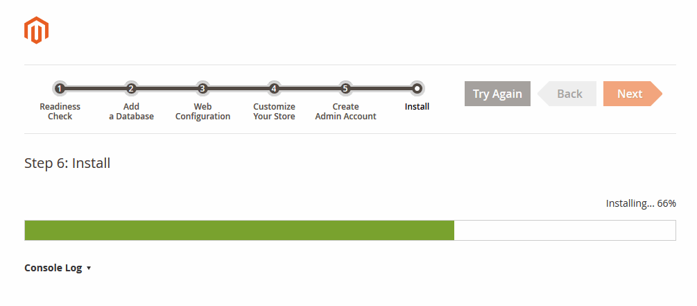 - You are ready to install Magento 2. Click on Install Now button and Installation will be started with the following screen.