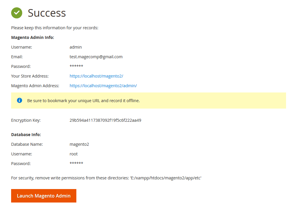 - You have successfully installed Magento 2, there will somethings which may require to run the Magento 2 correctly. Check FAQ.