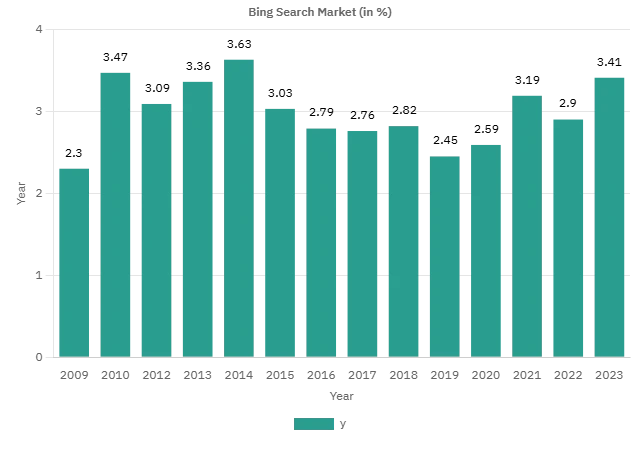 • As of September 2023, the market share of Bing was 3.41%, which spiked up to 3.73% in 2024.
