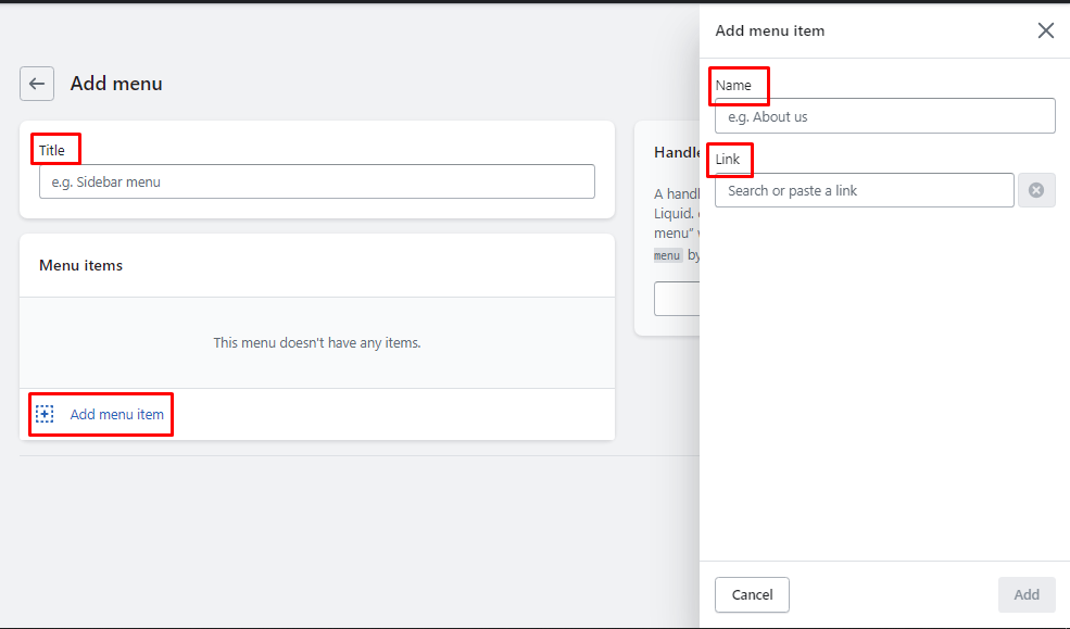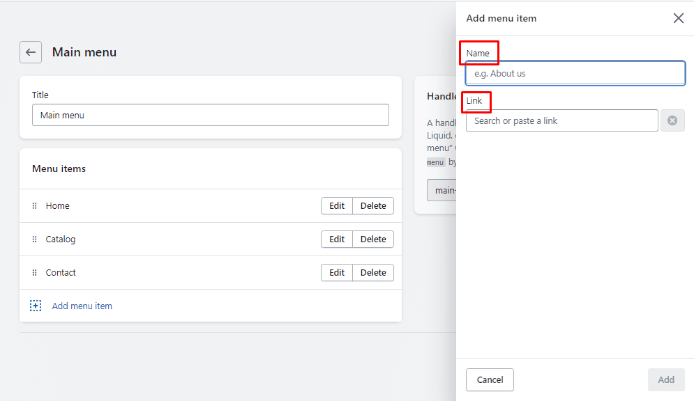 - To add items to your new Shopify navigation menu, click on the Add menu item button. It will open a menu item detail box.