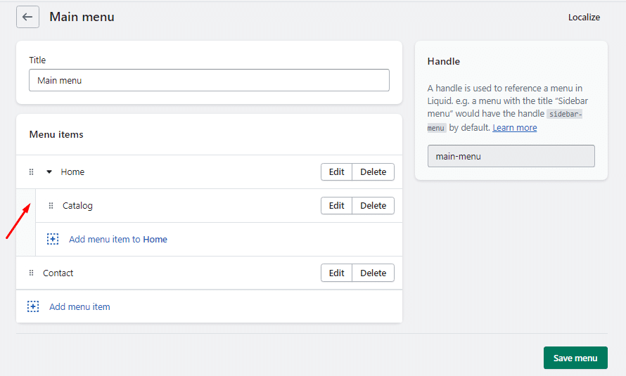 - To create a dropdown menu, click on the “Add submenu” button below a menu item and repeat the process.