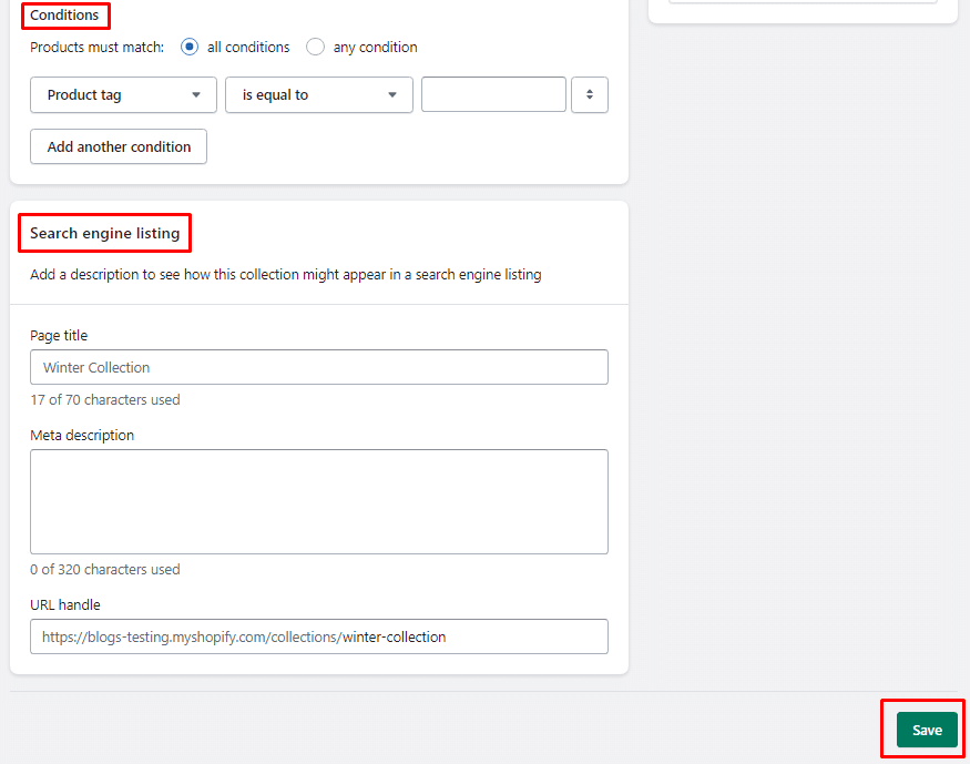 Once you complete all the settings of automatic collection in Shopify, click Save.