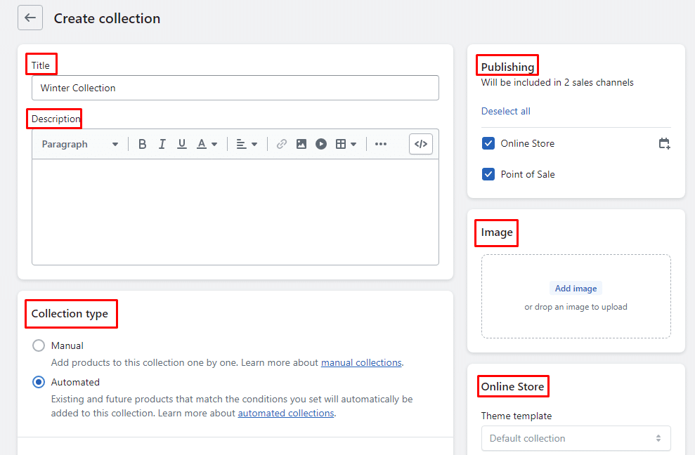 - Description – Add a description stating what type of products this collection consists of.