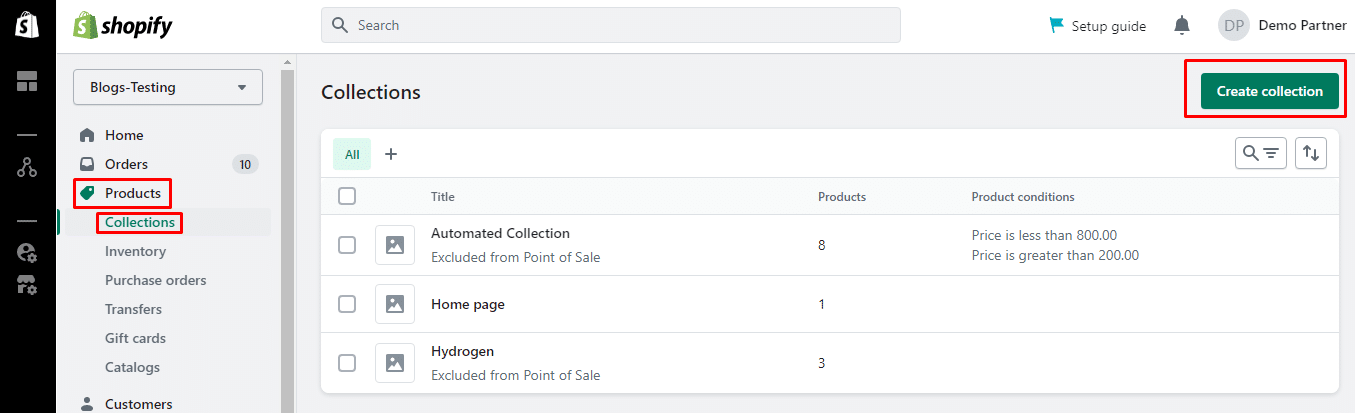 Step 2: From the left menu, go to Products > Collections. Then click on the Create collection button from the upper right corner.
