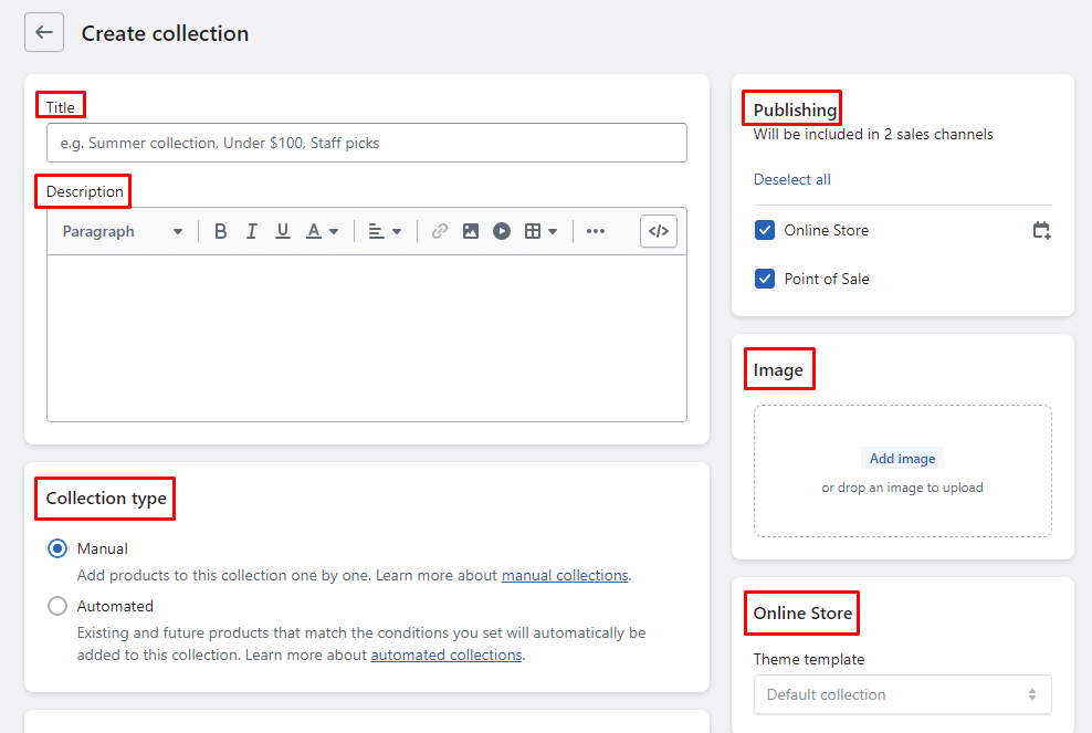 - Publishing – This states in which sales channel you want to make your collection available.