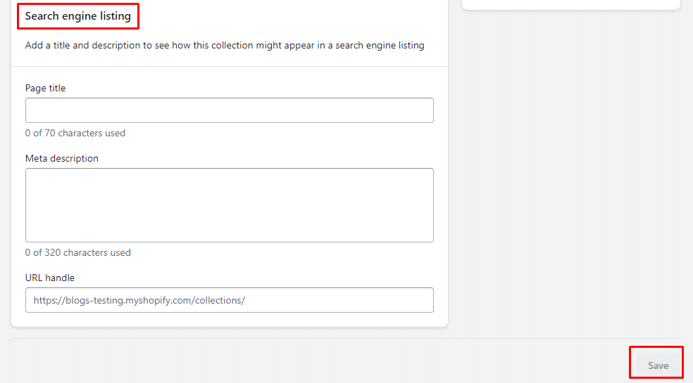 - Search engine listing – Add the page title and meta description for this collection on Shopify to help search engines find your link easily. You can also update the URL of the collection.