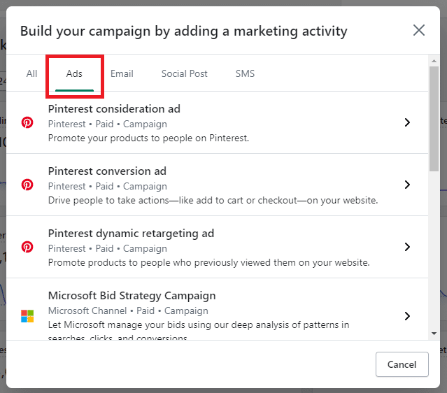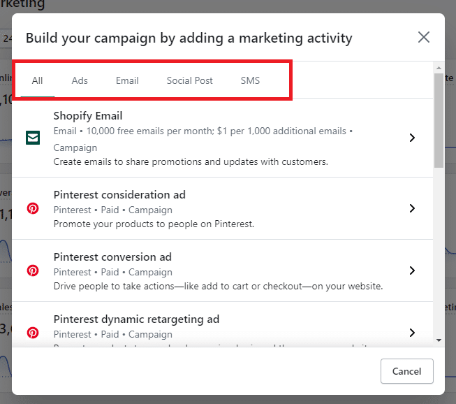 If you have installed Shopify plugins for marketing, then you will have a list of marketing campaigns through websites that are installed.