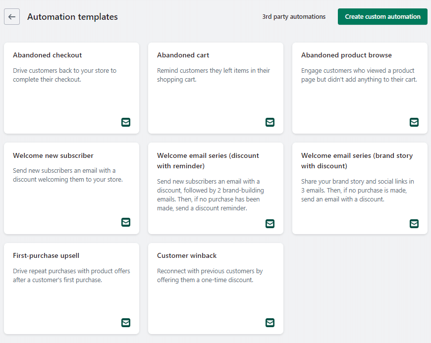 You have the option to use pre-made templates for your automation, or you can create custom automation. Depending on the email message you want, you can choose the appropriate type of marketing automation.