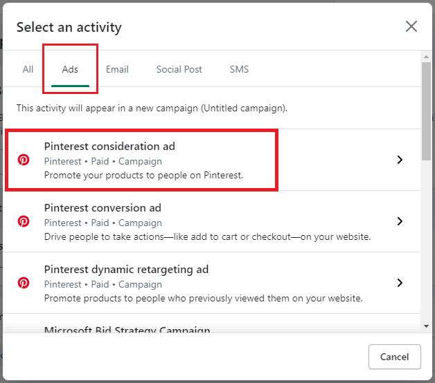 For instance, you have selected to run an ad campaign on Pinterest. For this, you need to select the Pinterest consideration ad from the Ads section.