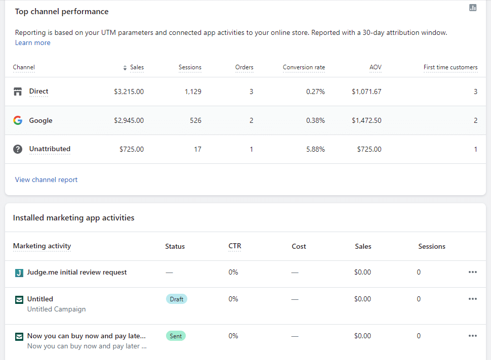 On this page, you will see all the analytics of your marketing campaigns, like the performance of different marketing campaigns and the activities from installed marketing apps.