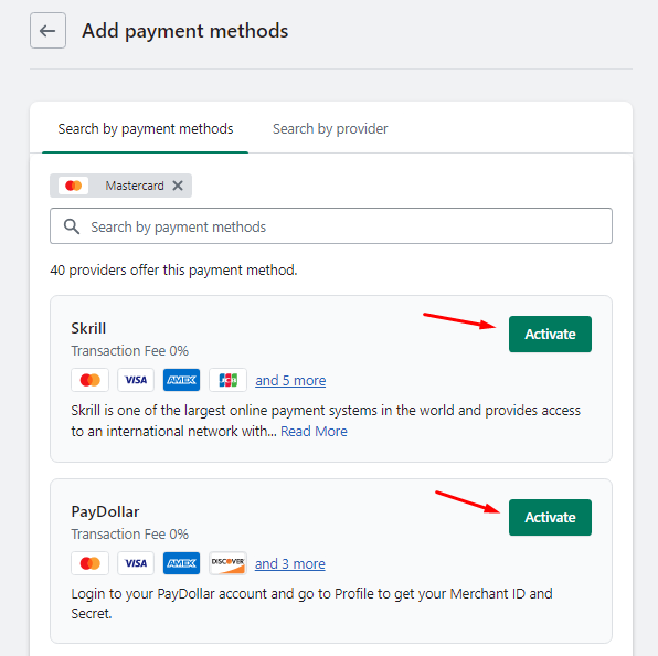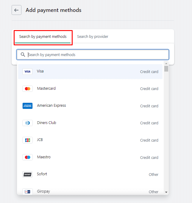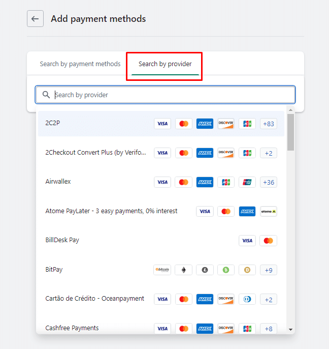 Step 5: Search a payment option by payment method or by provider name. Here, you can choose from the available payment providers Shopify offers.