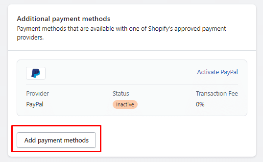 Step 4: On the Payments page, you’ll see the “Additional payment methods” section. Click on Add payment methods button to add additional Shopify payment options.