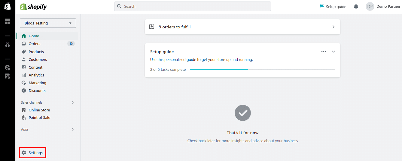 Step 2: Click on Settings in the lower-left corner from your Shopify admin.
