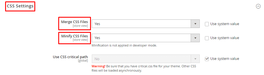 - Now set Merge CSS Files and Minify CSS Files fields to Yes.
