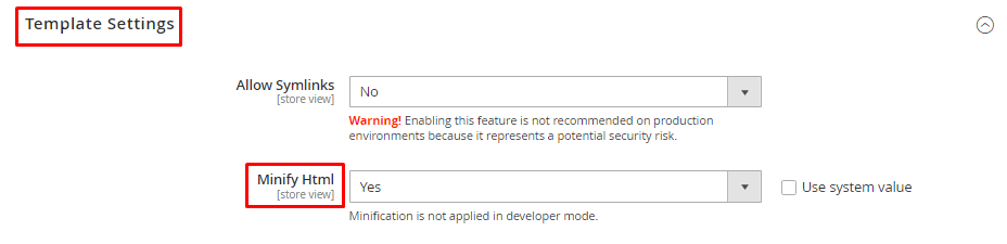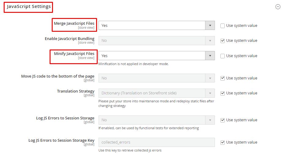 - Now set Merge JavaScript Files and Minify JavaScript Files fields to Yes.
