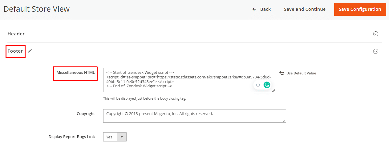 Step 4: Expand the Footer section and paste the Zopim Widget code in the Miscellaneous HTML field.