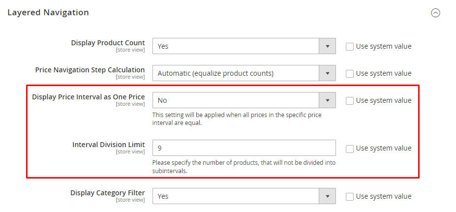 - Display Price Interval as One Price: Set if you want to display price interval if all prices in the specific price interval are equal.