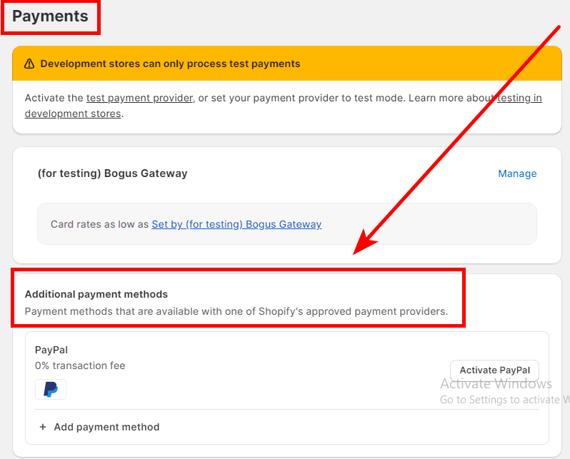 Select the add payment method text, and search for the credit card payment options you want to activate on your Shopify store.