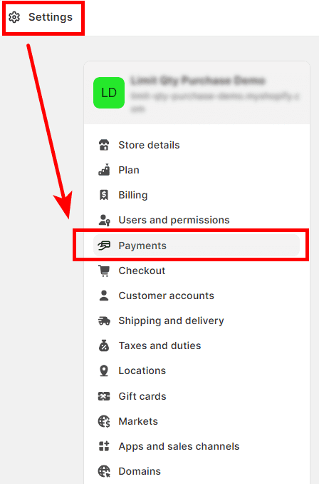 Shopify admin panel → Settings → Payments