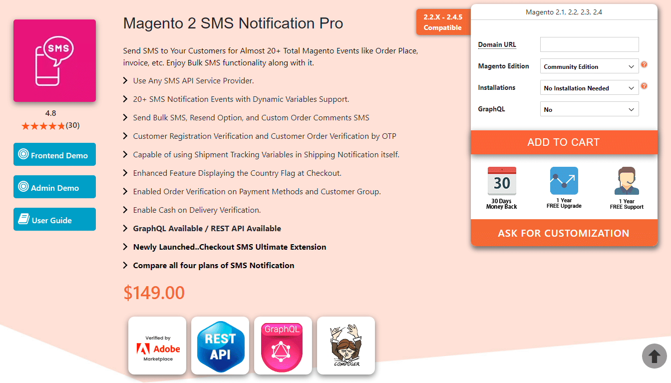 Our SMS Notification Pro Extension for Magento 2 makes it a hat trick by being on the top-performing extension list for three consecutive years. The main advantage of the SMS Notification module is to increase customer satisfaction and grow the list of happy customers by informing them at all stages of their order placement to order receiving.