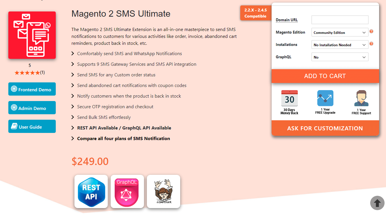 SMS Ultimate Extension for Magento 2 by MageComp consists of whole nine yards for sending SMS alerts to customers. In addition to sending customized text messages to customers, it also sends WhatsApp notifications for orders. It allows adding of custom SMS API and WhatsApp API as per requirement. Also, send abandoned cart notifications as well as out-of-stock notifications to customers.