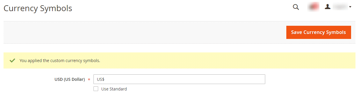 Step 2: The currency added to your store will appear here. If you want your custom currency symbol, uncheck the Use Standard checkbox and enter the currency symbol. Keep the Use Standard checked to use the standard symbol of the currency.