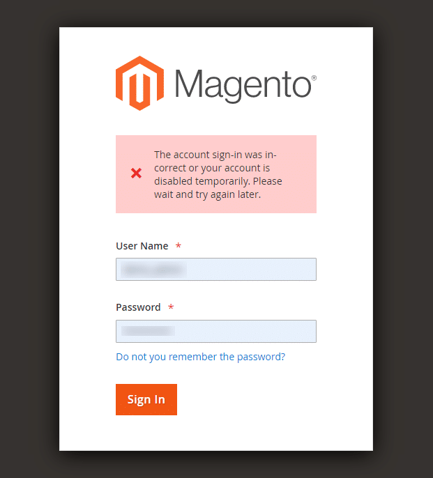 For safety reasons, the Magento admin user is automatically locked after six login failures. The locked users are seen on the locked user grid of the admin form. Another admin user with administrator permissions can unlock the locked admin user.