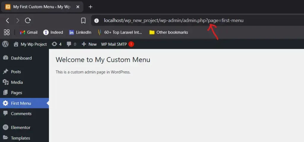 • ‘my_custom_menu_page()’: it is the callback function to display contents of your custom menu. For example purpose, here just a simple html is used to display page content.
