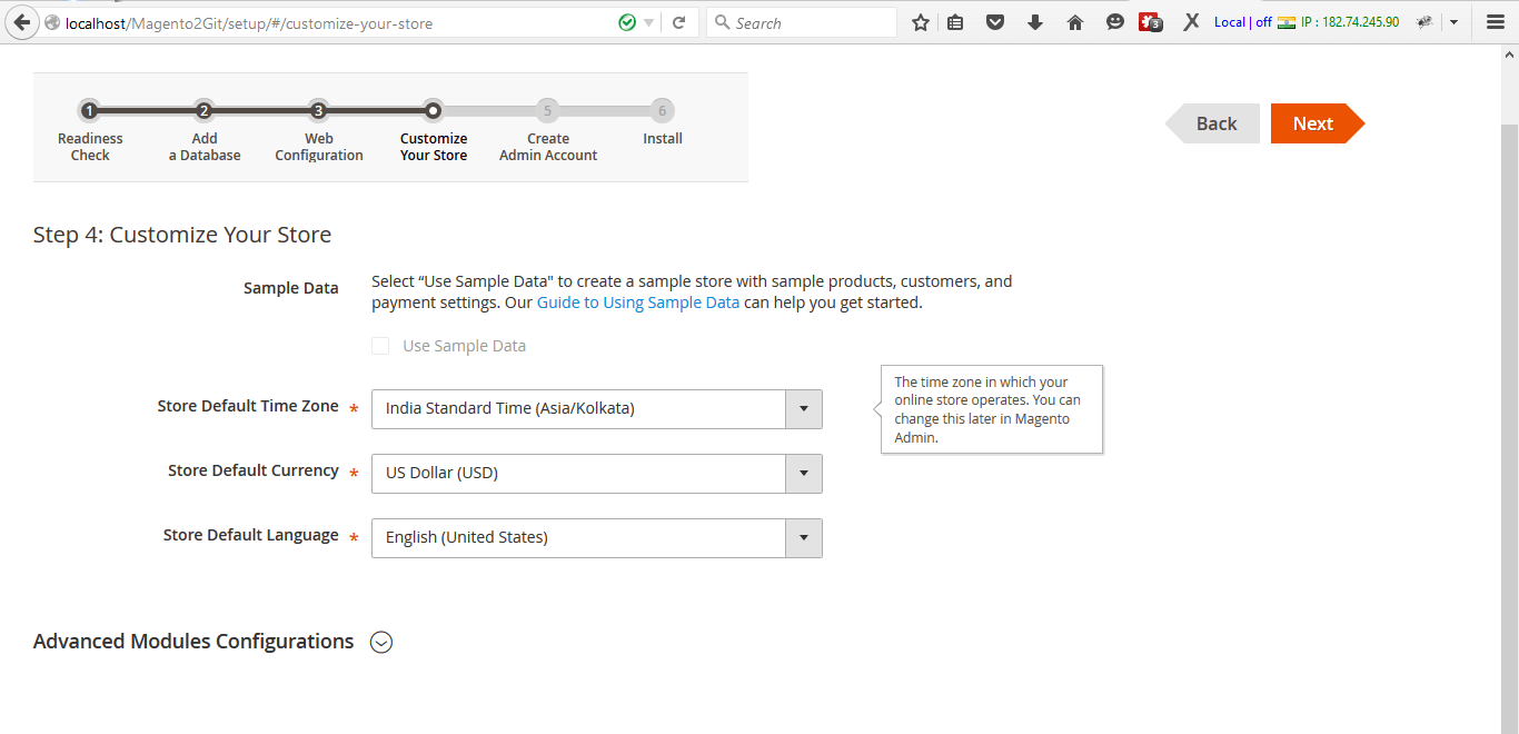- If you have already donloaded sample data then this screen will show the option. Set default time zone and click on Next.