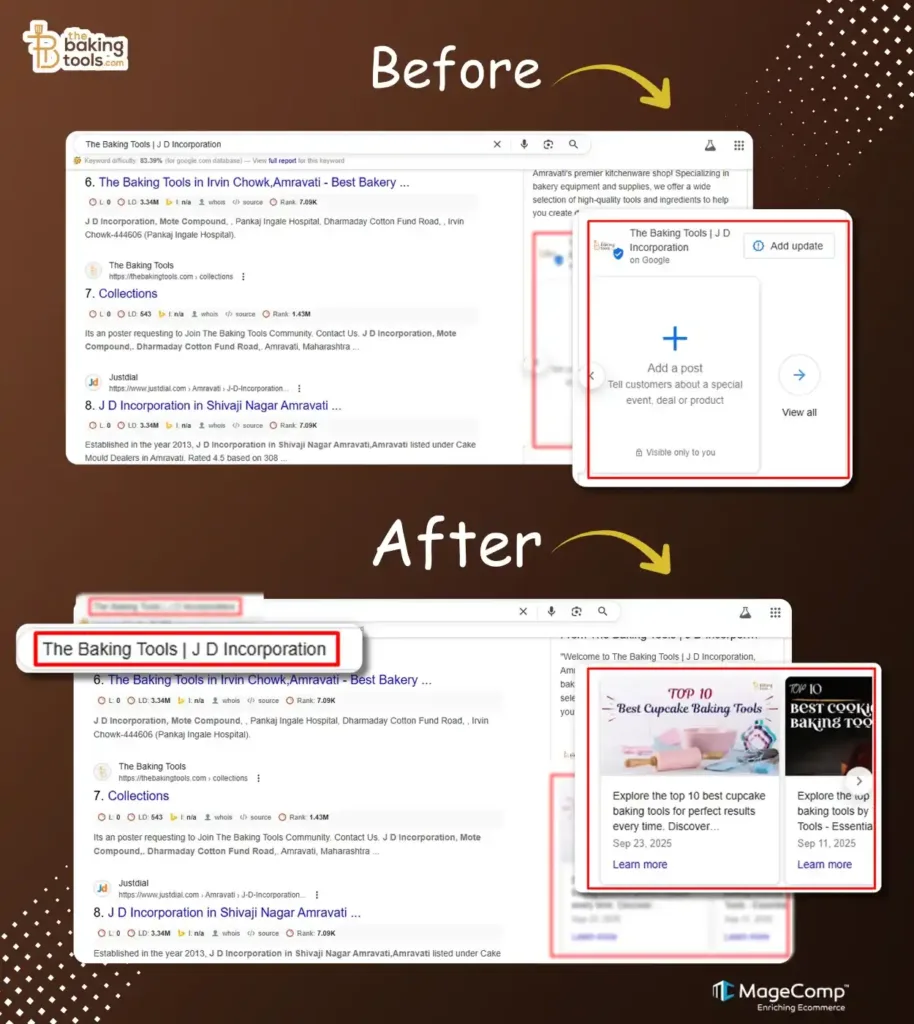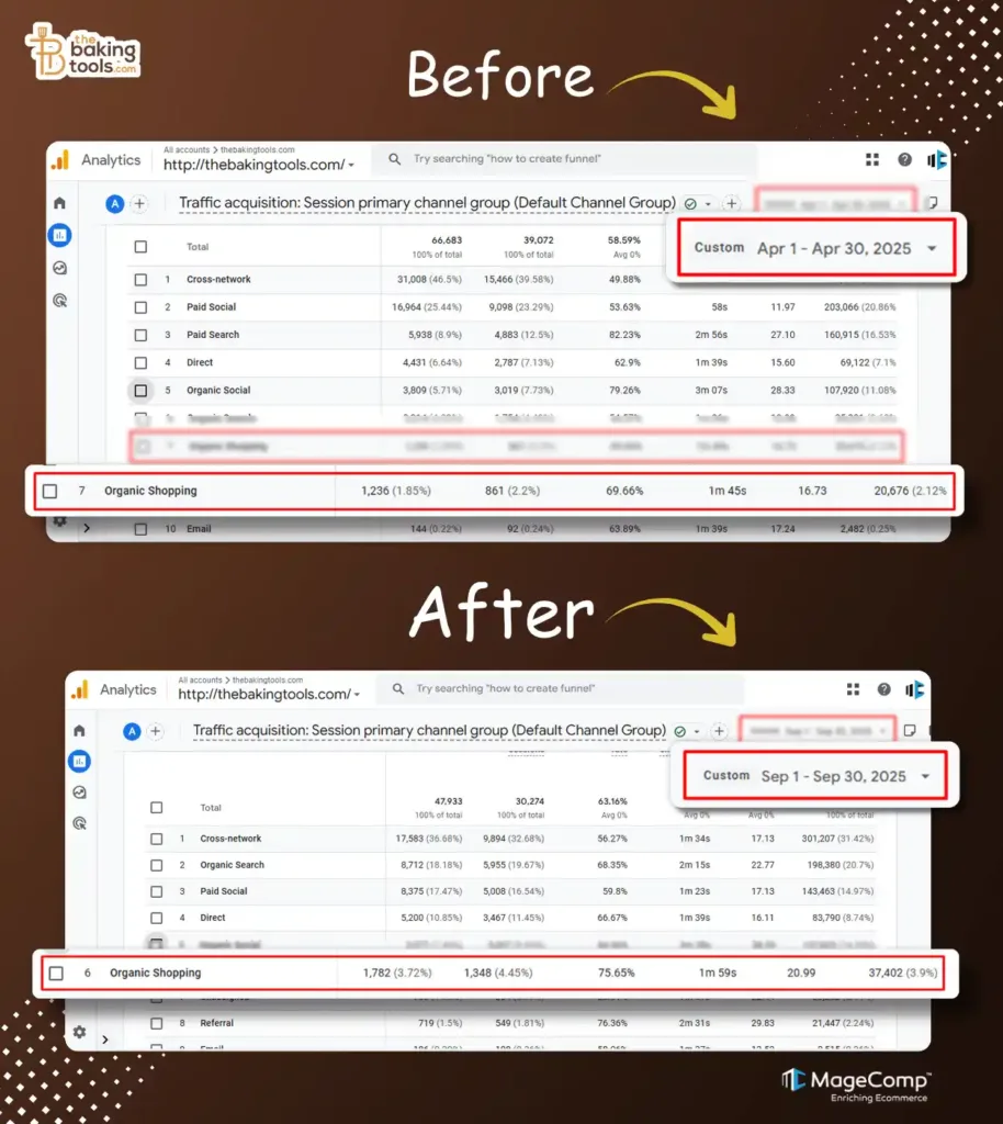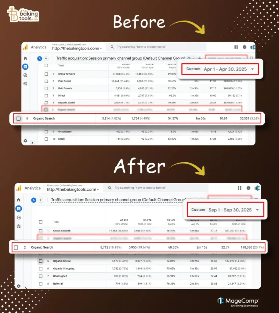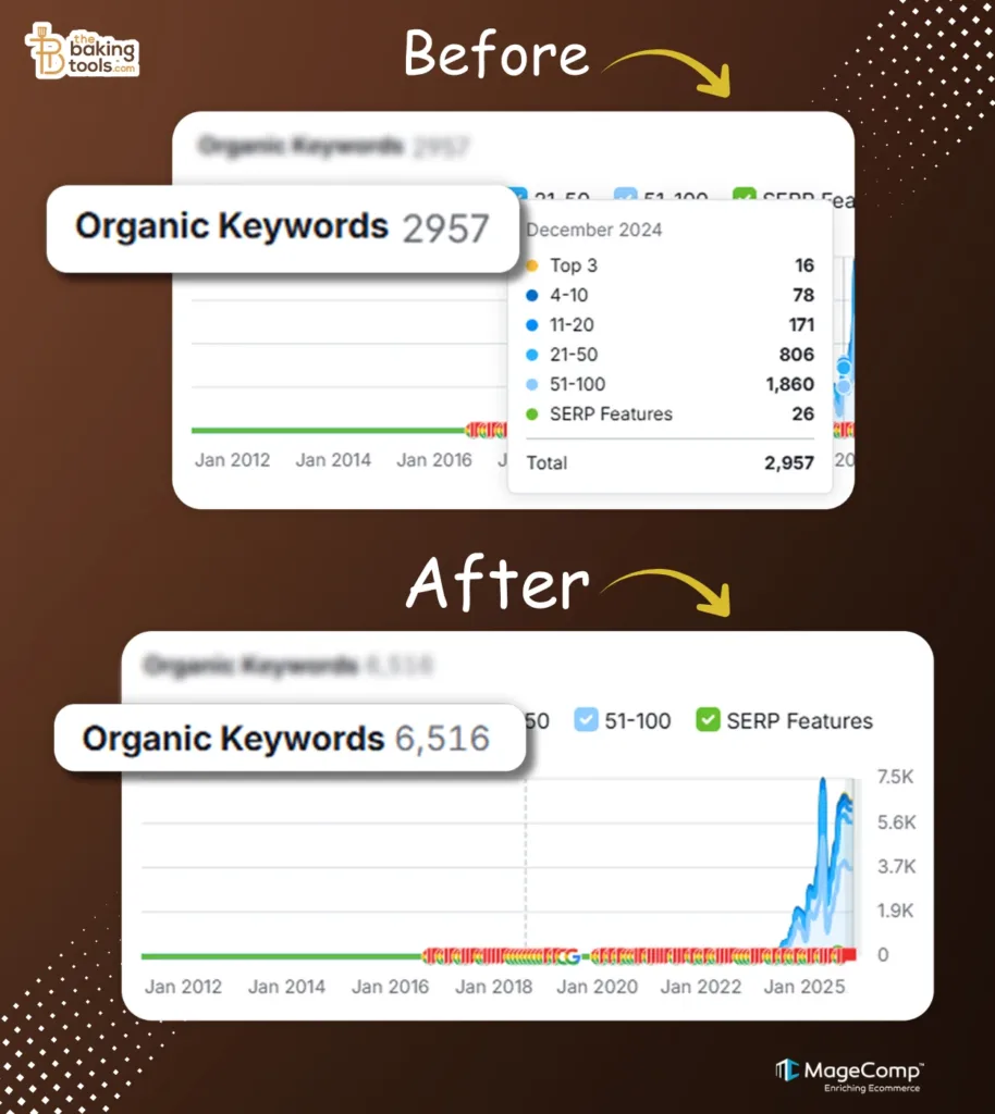 MageComp developed and implemented a comprehensive and regular content marketing plan, producing regular blog posts on baking trends, products, and guidebooks for educational content. This increased keyword rankings and improved the overall authority of the brand in the baking niche.