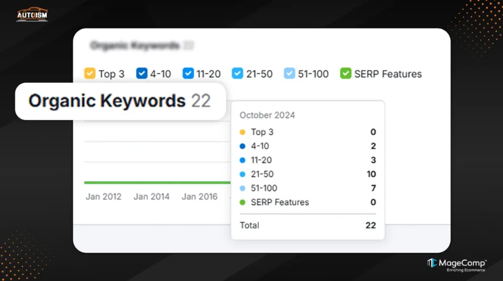 Autoism had low visibility and received just 54 organic visitors per month. This was caused by several issues, such as ineffective keywords, insufficient quality content aimed at targeted audiences, and a lack of visibility in SERPs. Solving these could vastly improve its visibility and presence online.