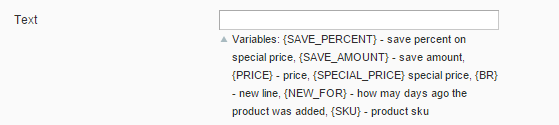 {SAVE_PERCEMT}, {SAVE_AMOUNT}, {PRICE}, {SPECIAL_PRICE}, {BR}, {NEW_FOR}, {SKU}