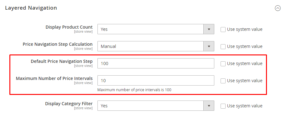 - Default Price Navigation Step: This specifies the number of products included in each step.